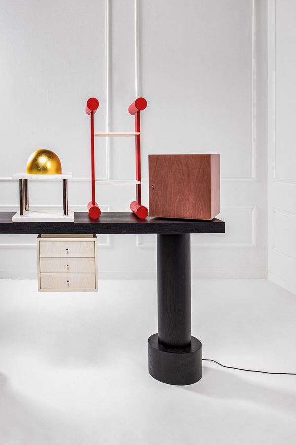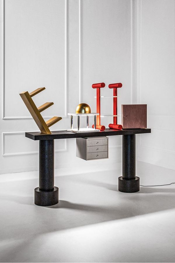 AcropoliConsole della serie BharataLegno dorato e marmo.Prod. Design Gallery Milano, 1988 ca.Etichetta del produttore.