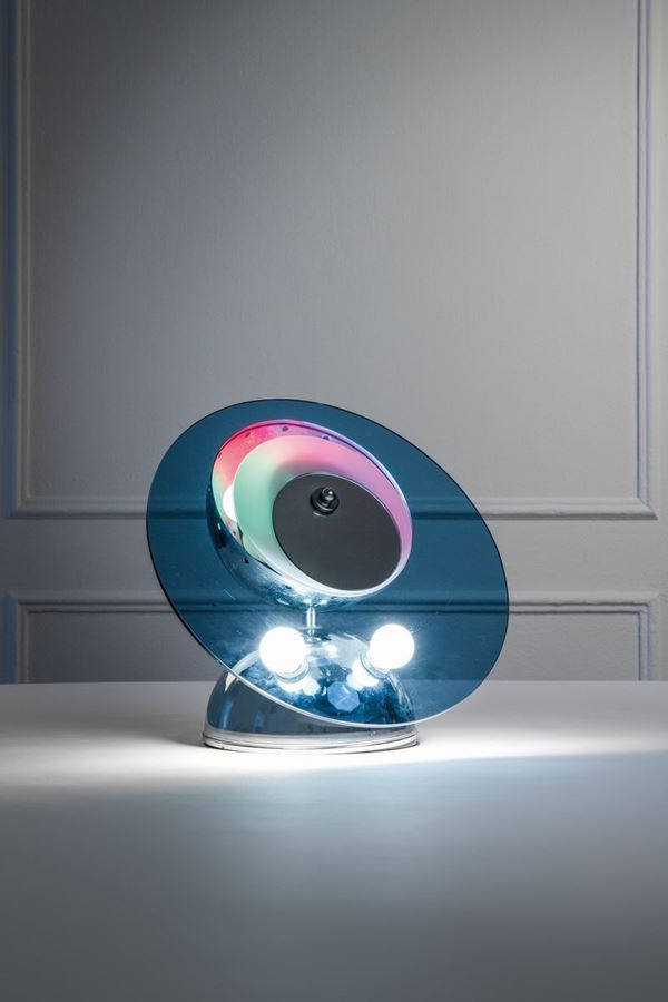 Lampada da tavolo cineticaMetallo cromato, cristallo colorato, vetro specchiato.Italia, fine anni '60