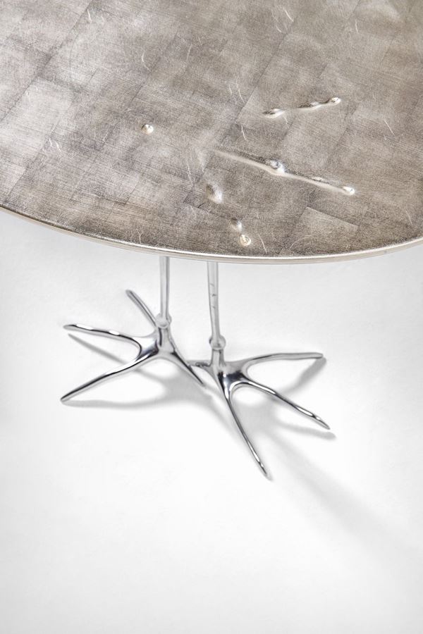 Fusione di bronzo argentato, legno rivestito in foglia d'oro bianco.