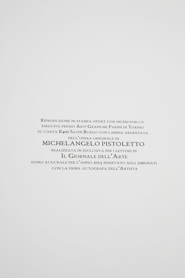 Eseguita presso Arti Grafiche Parini di Torino su carta R400 Satin Burgo con lamina originale dell'opera di Michelangelo Pistoletto.