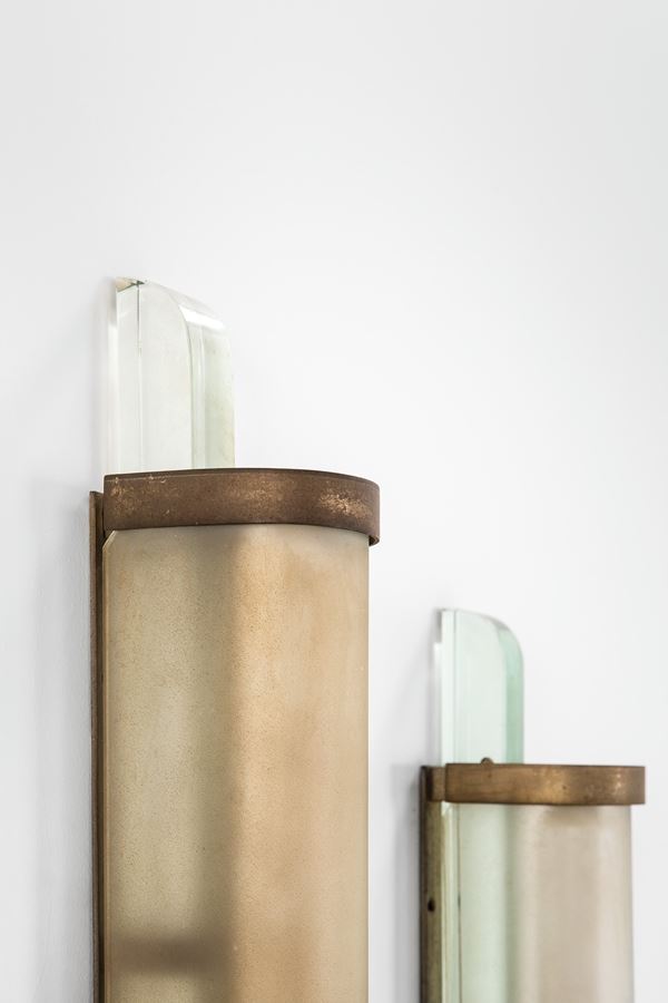 Ottone, vetro molato di forte spessore, vetro satinato curvato.