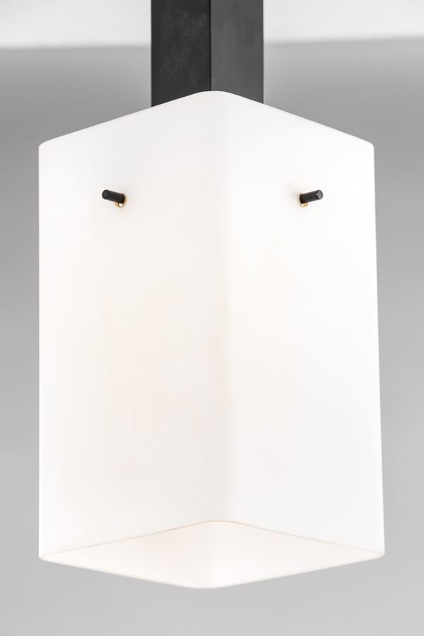 Metallo verniciato, ottone, vetro opalino satinato.