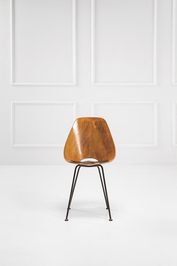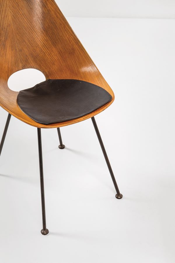 Tondino metallico verniciato, compensato curvato impiallacciato in legno di teak, cuscino in cuoio.
