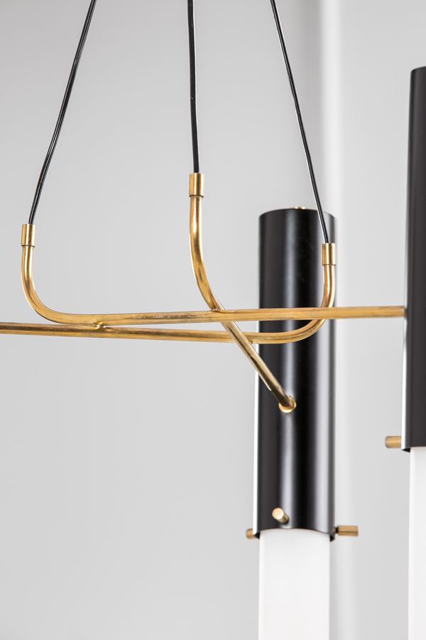 Ottone, metallo verniciato, vetro opalino.