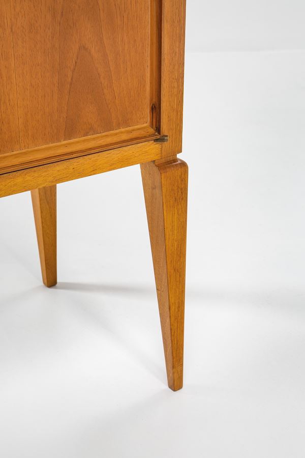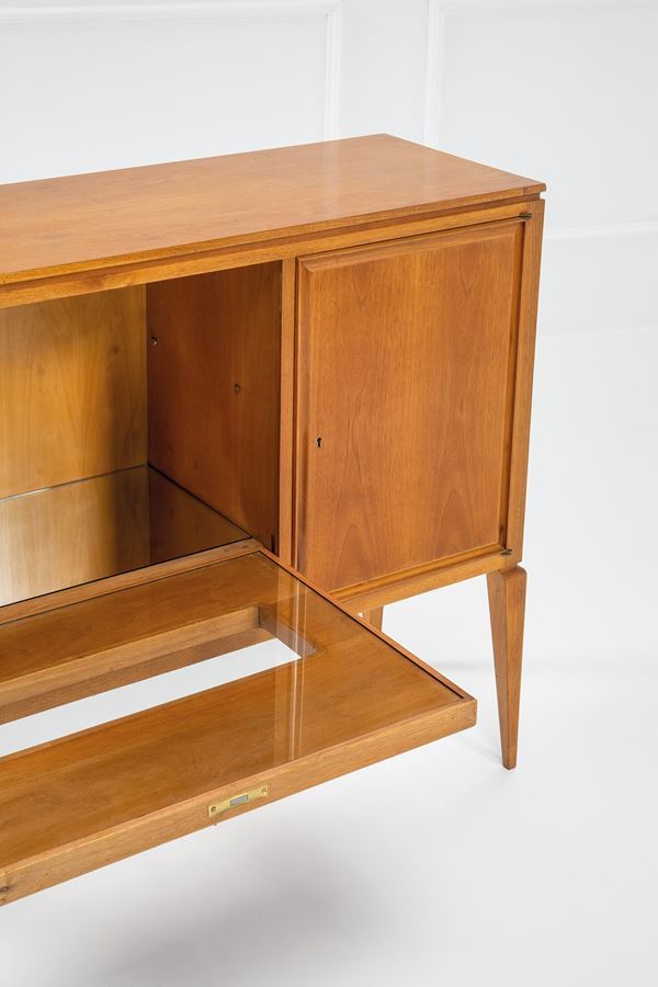 Legno massello, legno impiallacciato, vetro specchiato, cristallo, ottone.