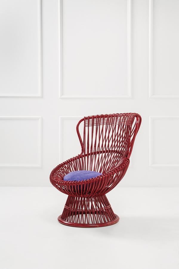 Malacca, giunco, canna d'India laccati, cuscino in alcantara.