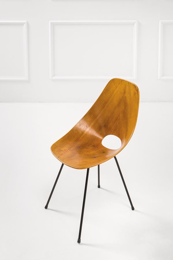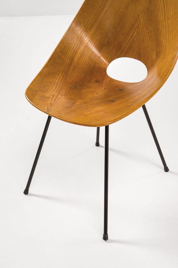 Compensato curvato impiallacciato in teak, tondino metallico verniciato.