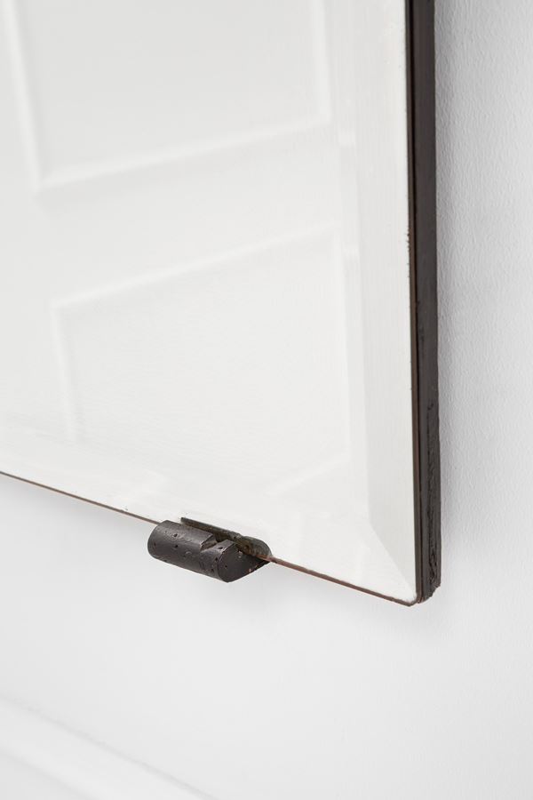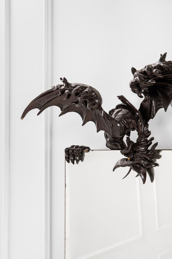 Legno scolpito a guisa di dragone, vetro specchiato, ottone.