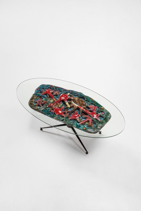 Metallo verniciato, ottone, cristallo, ceramica scultorea policroma smaltata.