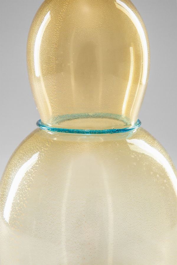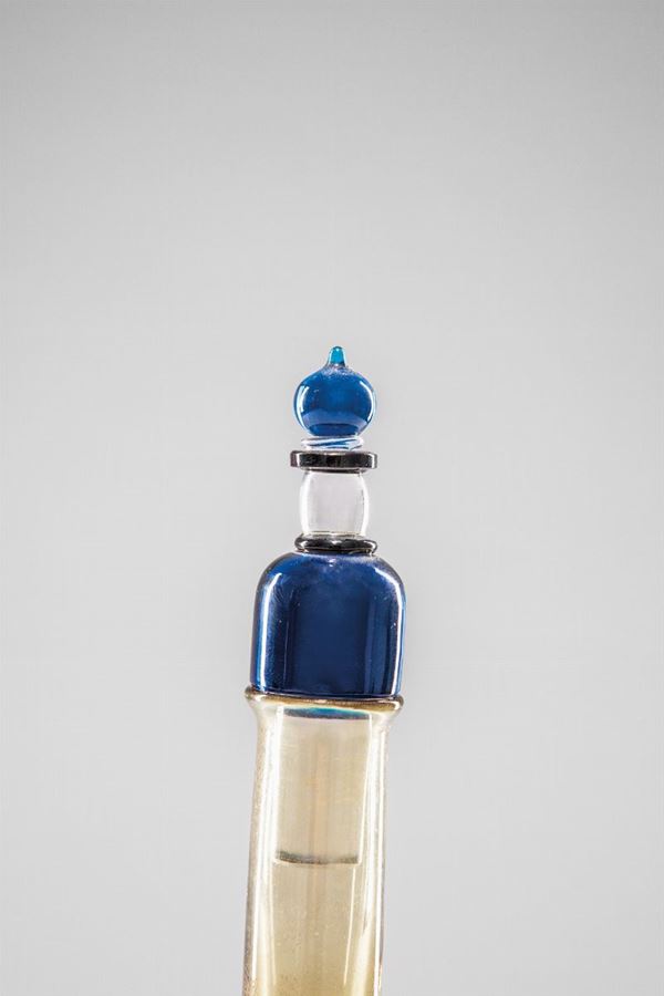 Vetro soffiato fumè dorato e filo acquamarina con tappo gioiello in vetro modellato e molato colore acquamarina e cristallo.