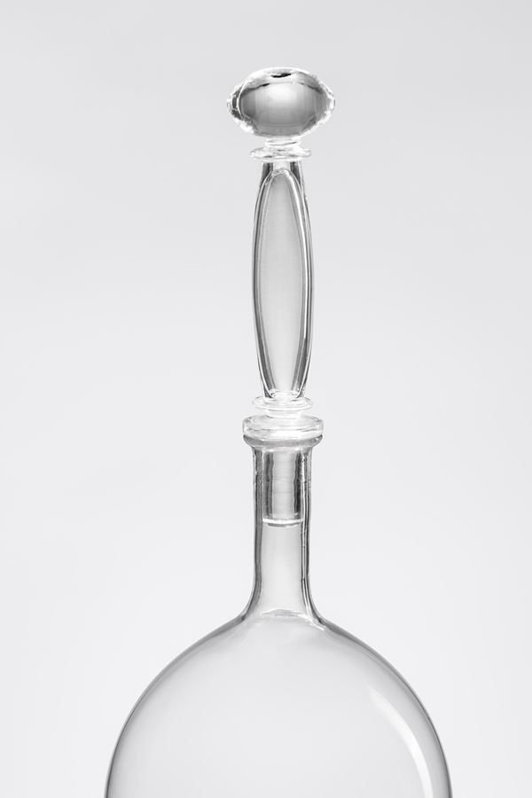 Vetro soffiato cristallo con tappo gioiello in vetro a forma di colonna classica sormontata da una sfera.