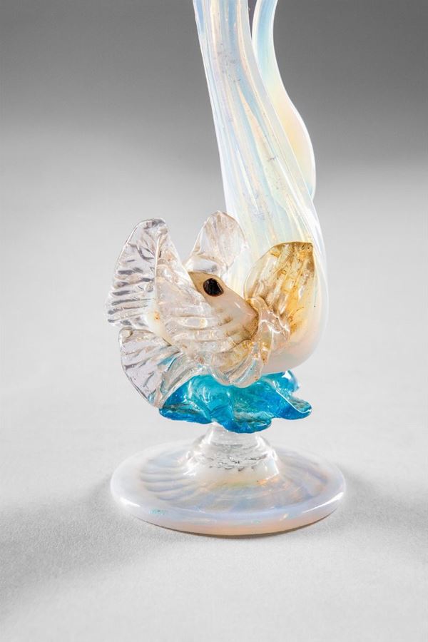 Vetro soffiato iridato a forma di pesce con applicazioni acquamare e foglia d’oro.