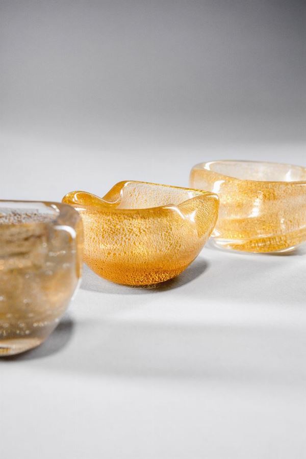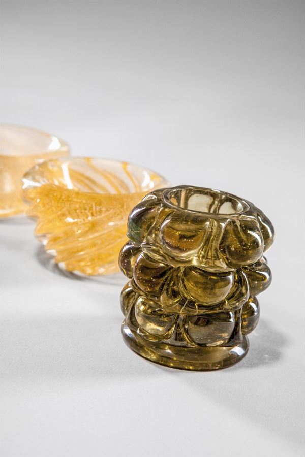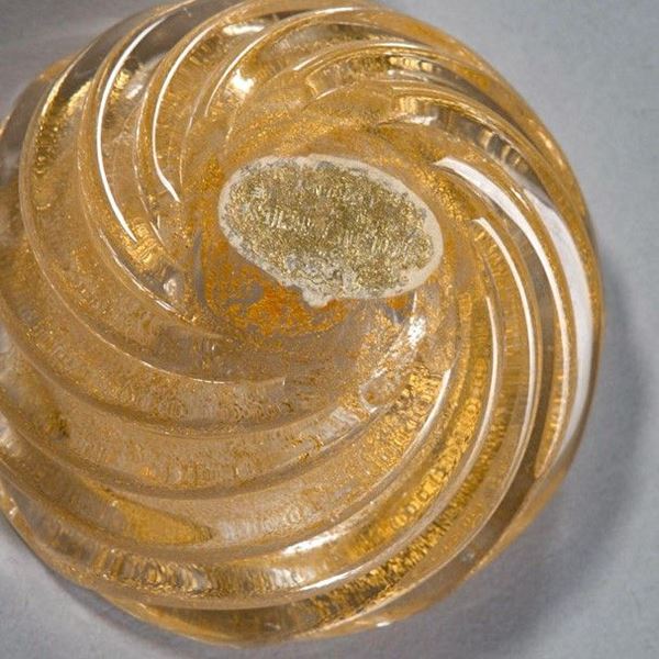 Vetro soffiato con inclusione di foglia d’oro e superficie lievemente iridata.