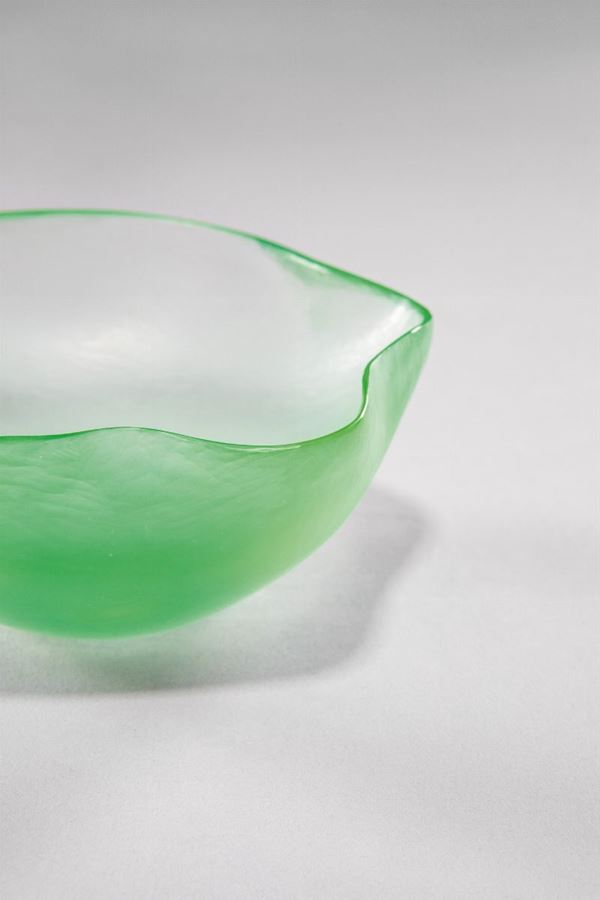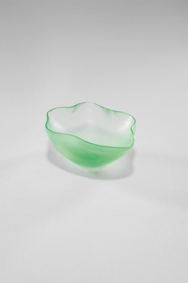 Vetro soffiato verdino con bordi ondulati e superficie rifinita a freddo da lievi molature.