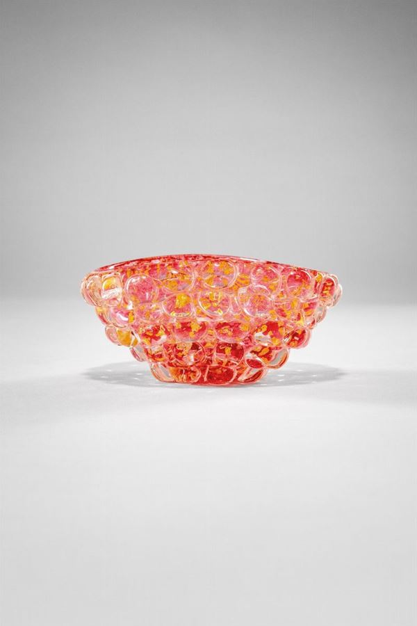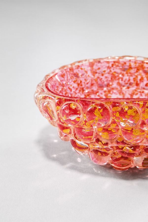 Vetro soffiato decorato con grosse semisfere ottenute a stampo e foglia d’oro.