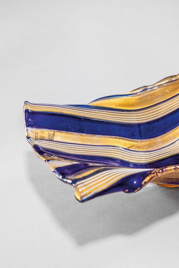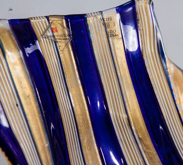 Vetro soffiato a fasce e canne orizzontali blu e oro.