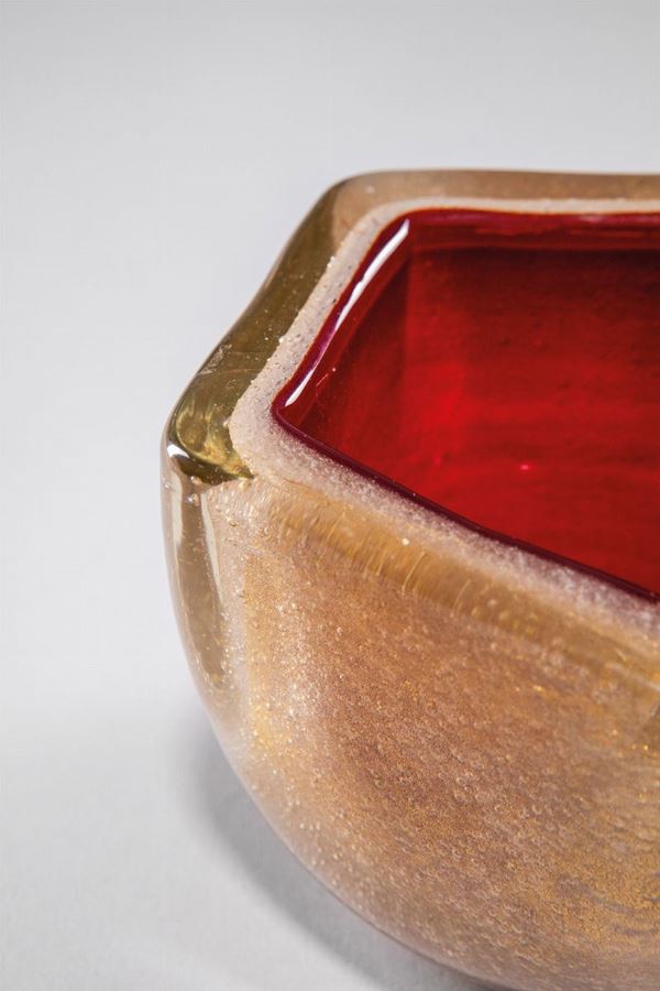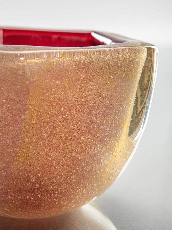 Vetro sommerso rosso porpora e lattimo con inclusione di foglia d’oro.