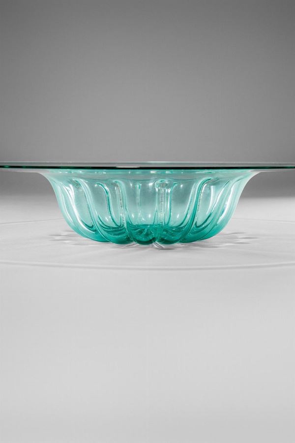 Vetro soffiato trasparente verdino con fondo baccellato.