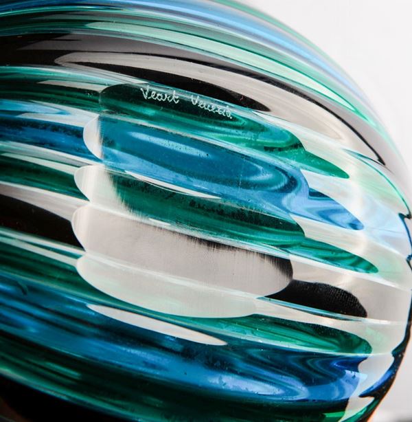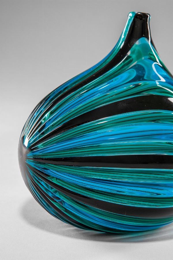 Vetro soffiato con fasce cristallo, verde nero e turchese disposte in orizzontale su tutta la superficie.