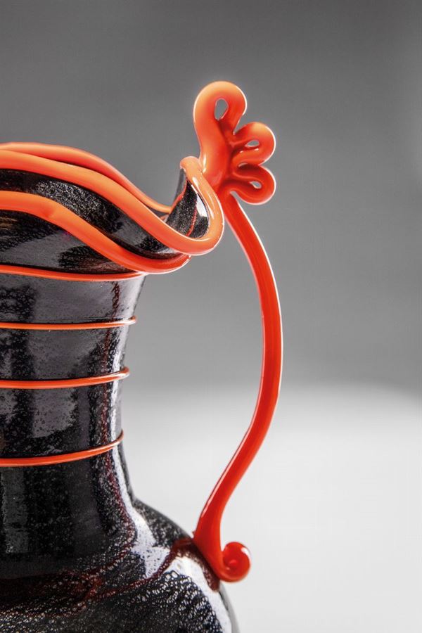 Vetro nero e foglia d’argento con anse in pasta vitrea arancione applicate a caldo.