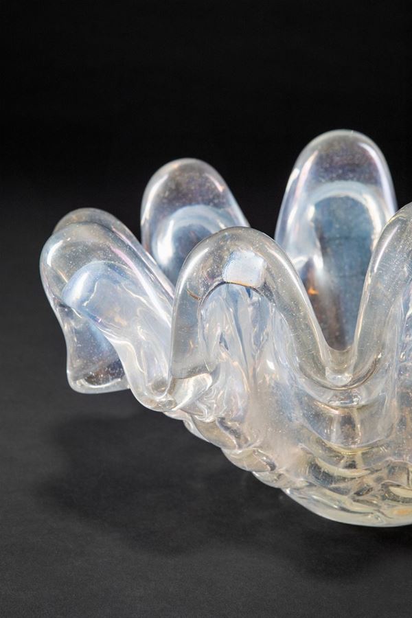 Vetro pesante iridato con corpo sagomato a ventaglio e lobi molto pronunciati.