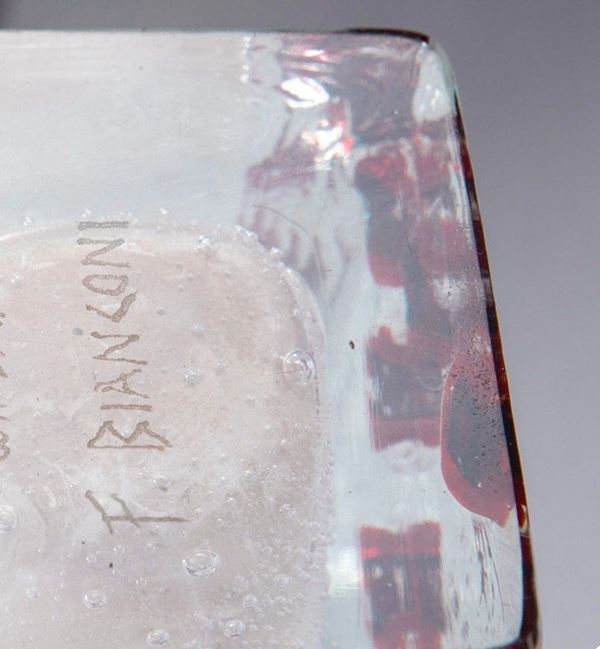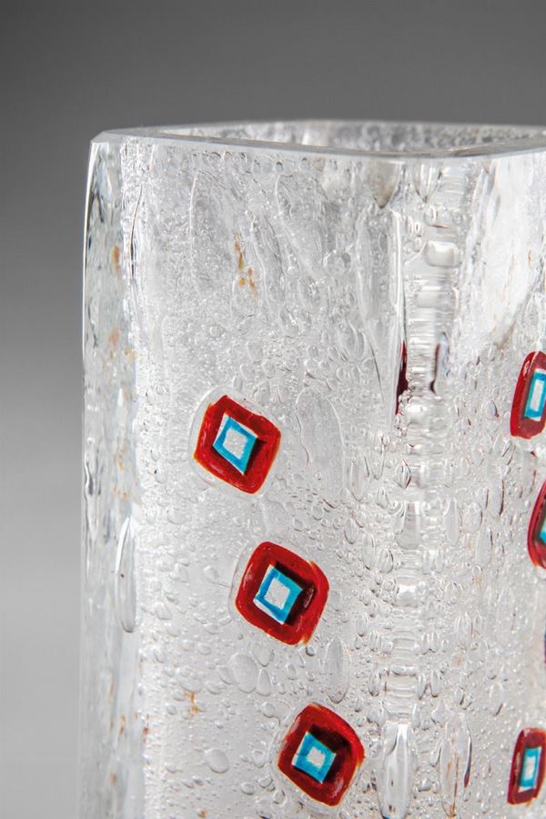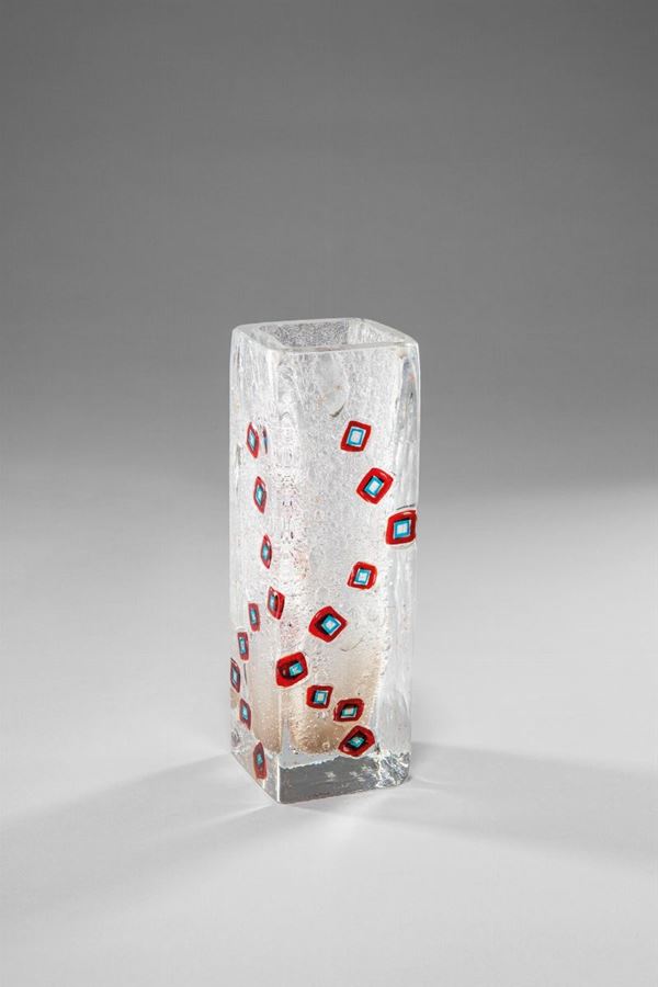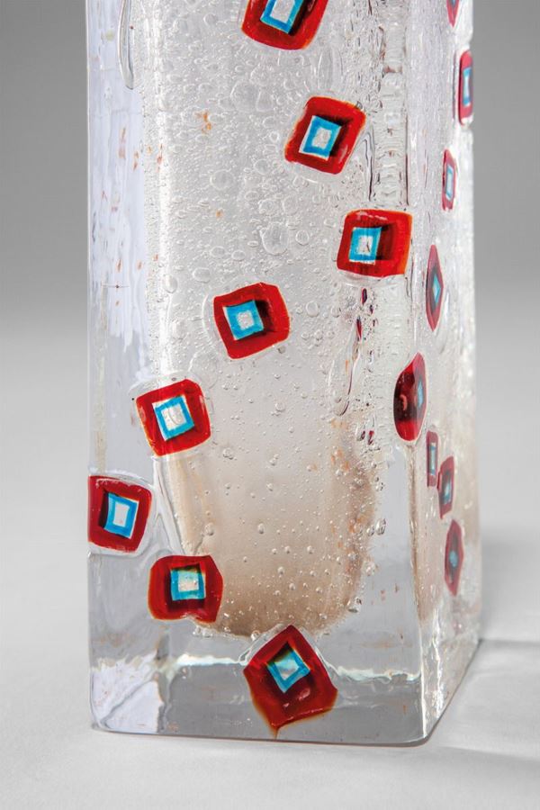 Vetro soffiato cristallo a sezione quadrata decorato con murrine policrome.