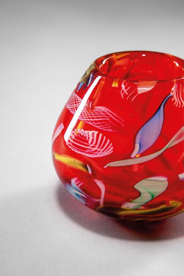 Vetro soffiato rosso con sommersione di frammenti di canne policrome.