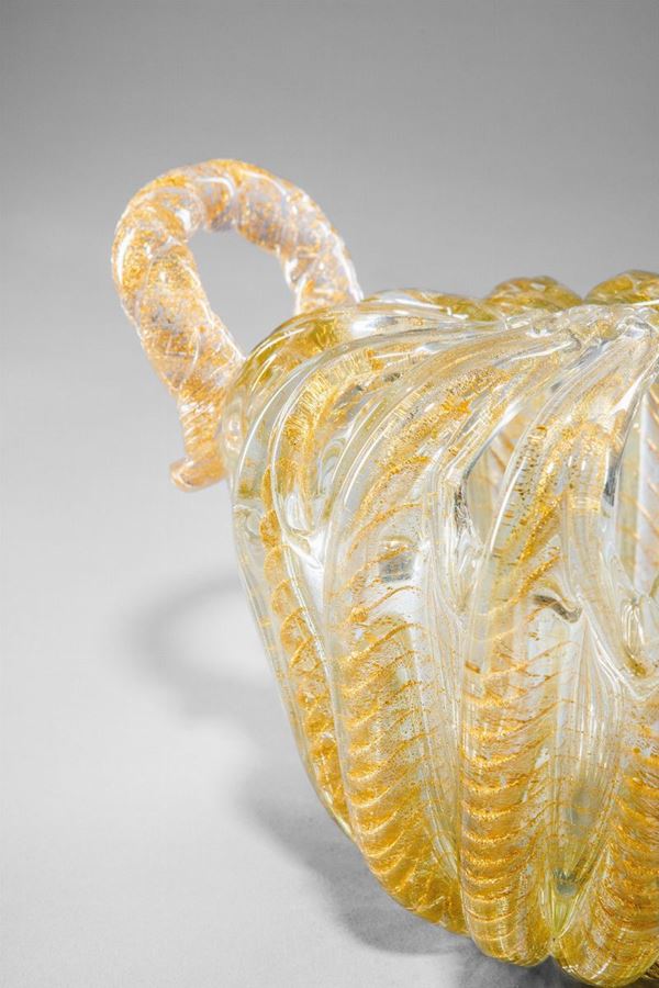 Vetro soffiato a grosse costolature ritorte e foglia d’oro. Manici applicati a caldo.