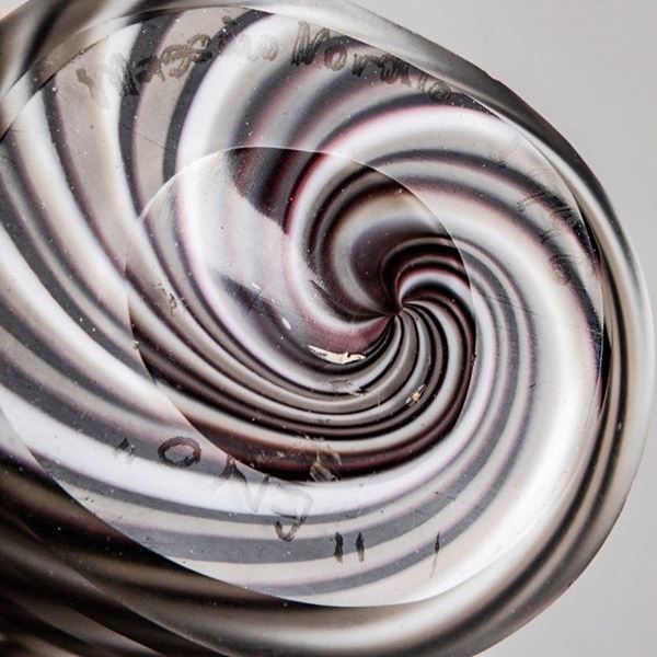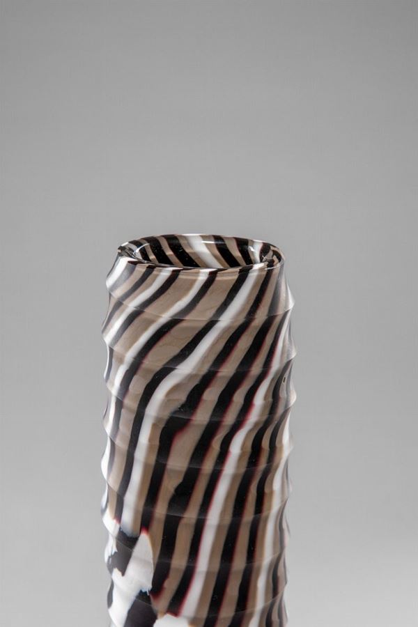 Vetro soffiato a canne nere, grigie e lattimo disposte a spirale; superficie completamente battuta.