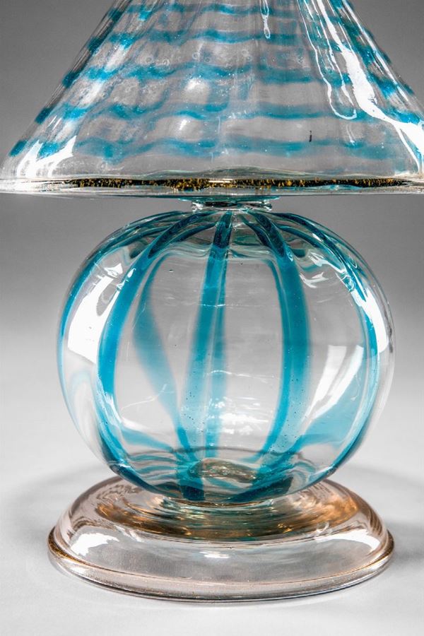 Il cono in vetro incolore ritorto decorato da una spirale blu e filo cristallo con foglia d’oro applicato a caldo sul bordo; la sfera in vetro incolore decorata da fili blu verticali; la base in vetro incolore con foglia d’oro.