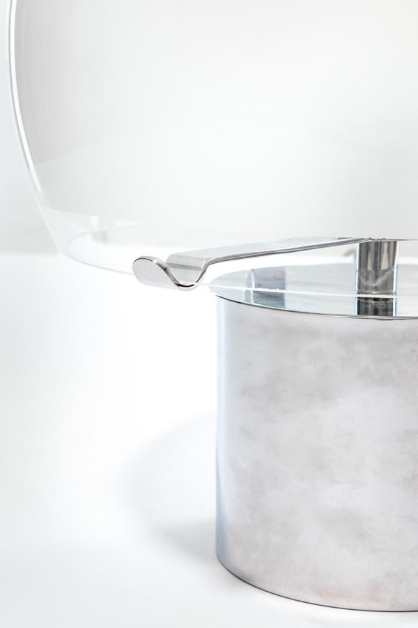 Ottone cromato lucido, vetro soffiato smerigliato internamente con fascia trasparente.