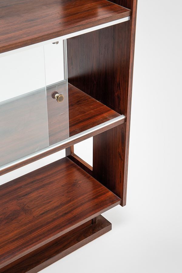 Legno impiallacciato in palissandro, cristallo, ottone.