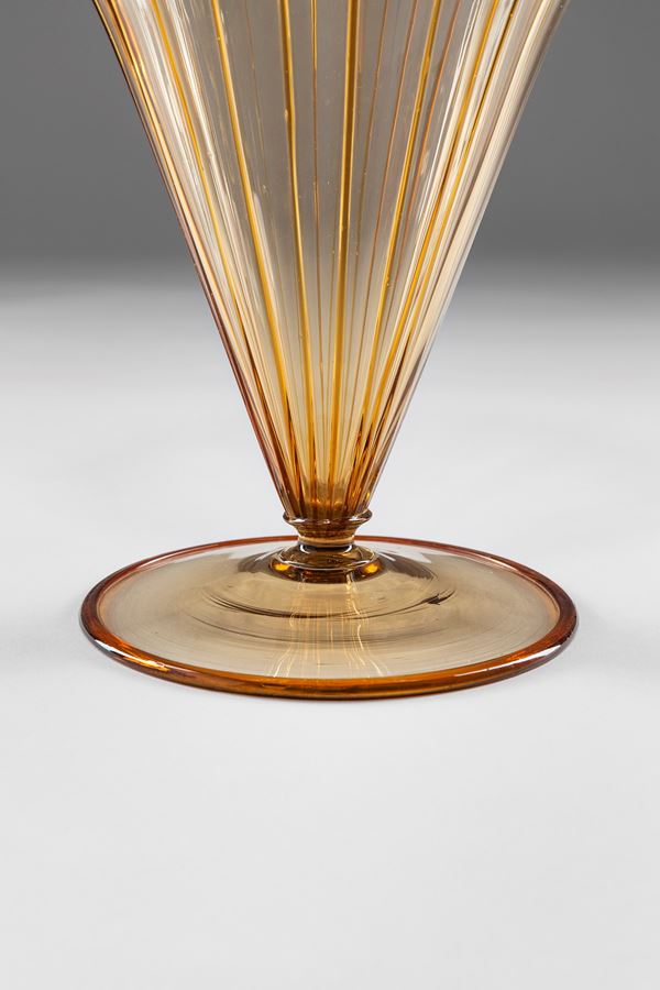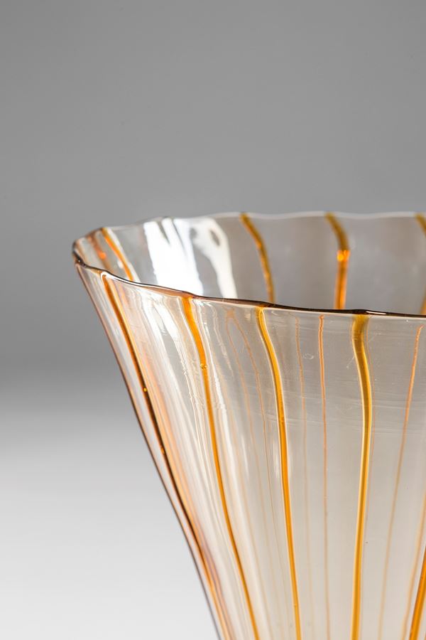 Vetro trasparente con piede a disco, corpo costolato rigato da fili applicati di vetro ambra.