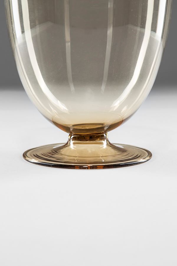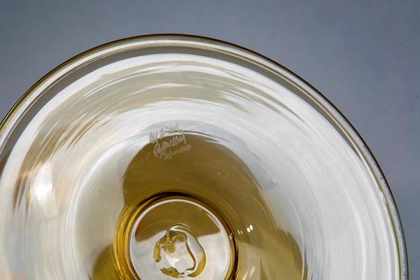 Vetro soffiato trasparente pagliesco con piede a disco.