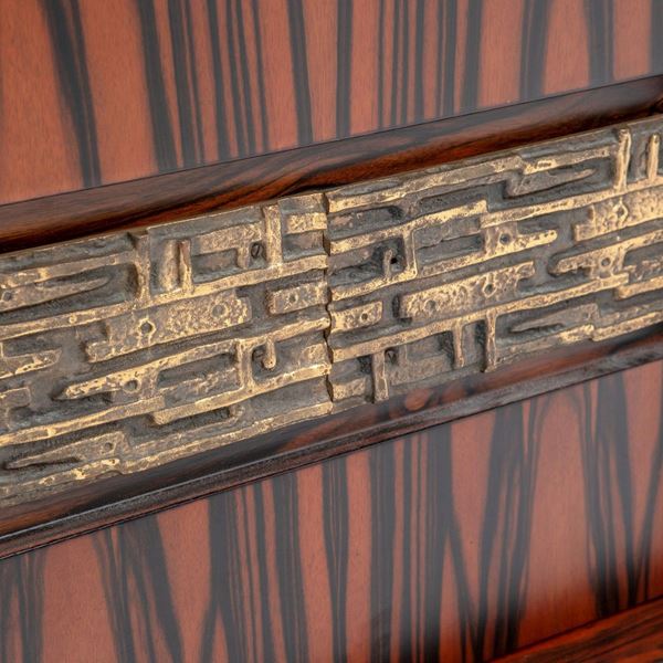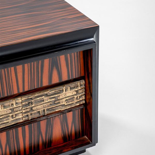 Legno di ebano con decorazione in fusione di bronzo. Interni con ripiani.