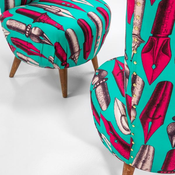Gambe in legno, rivestimento con tessuto Fornasetti Pennini.