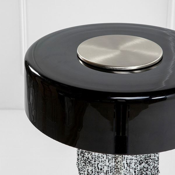 Metallo cromato, vetro opalino nero con perle cristallo e nere.