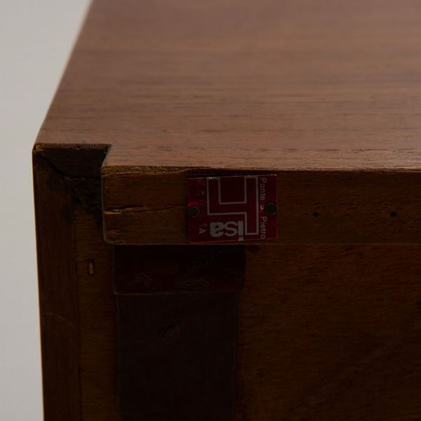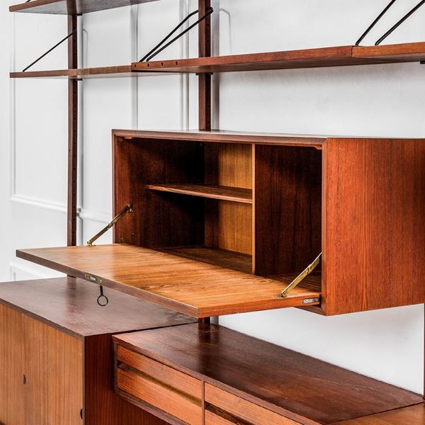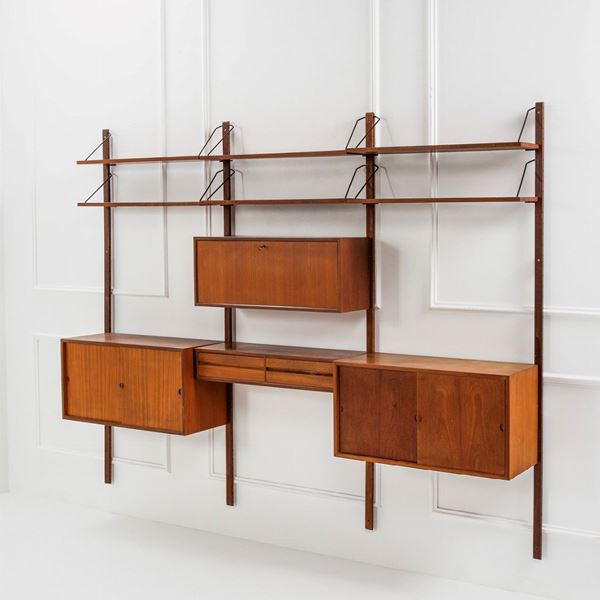 Composta da due moduli contenitori con ante scorrevoli e uno con ribalta, una cassettiera e sei mensole.