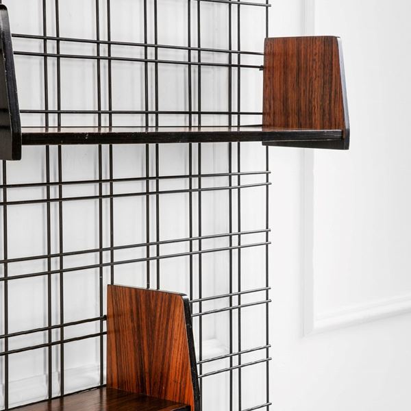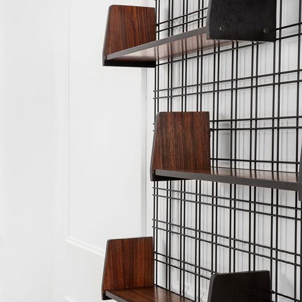 Griglia in metallo laccato, ripiani in legno multistrato curvato.