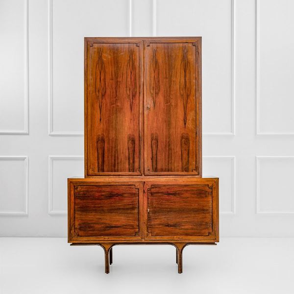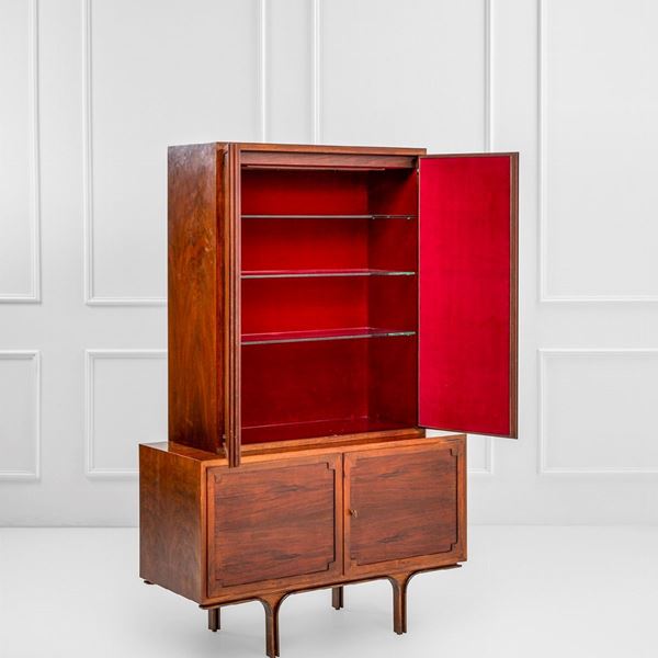 Multistrato curvato e multistrato impiallacciato in legno di palissandro, pianetti interni in cristallo.