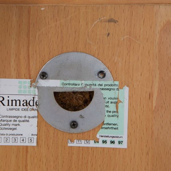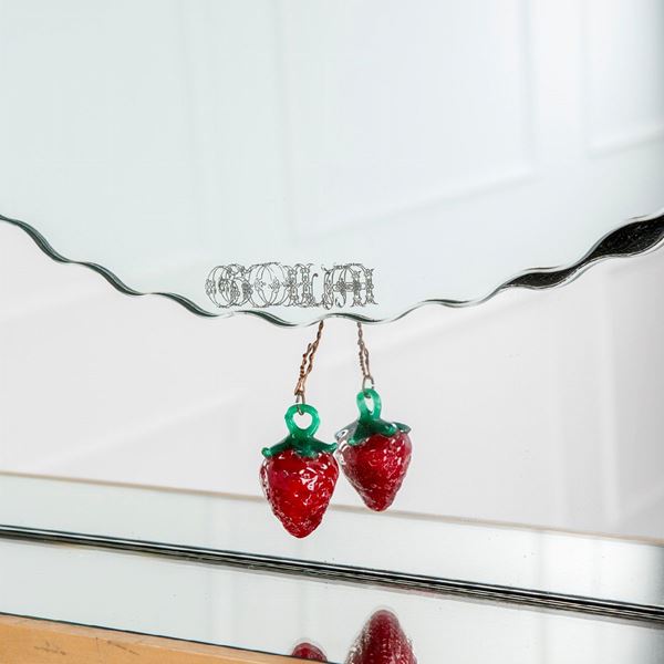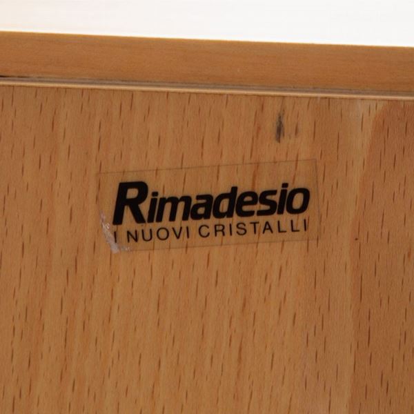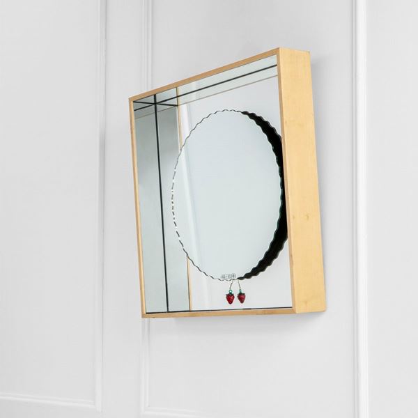 Legno di faggio naturale, vetro specchiato, vetro di Murano colorato.