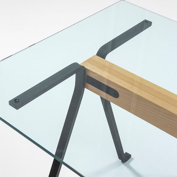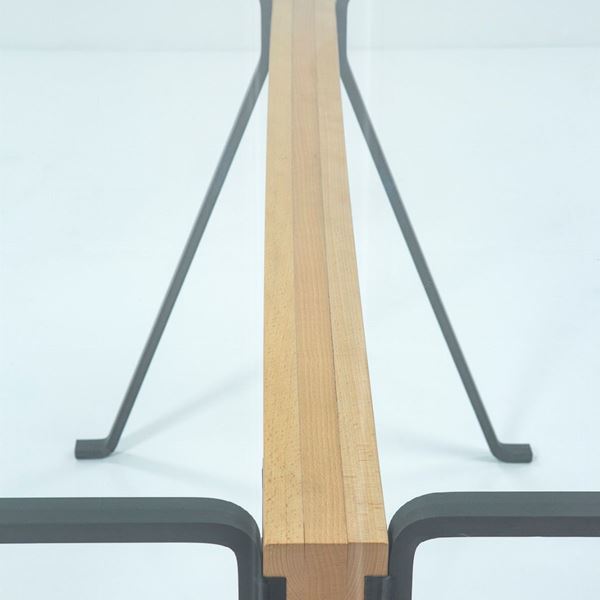Profilato di ferro grezzo, legno di faggio massello, piano in cristallo.