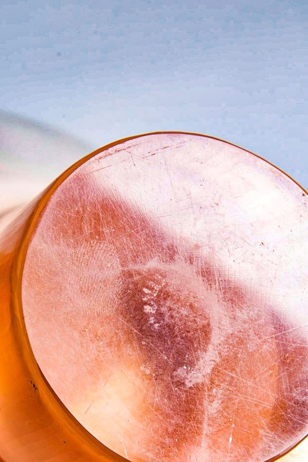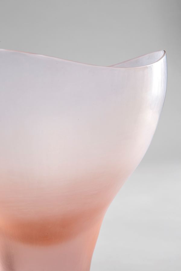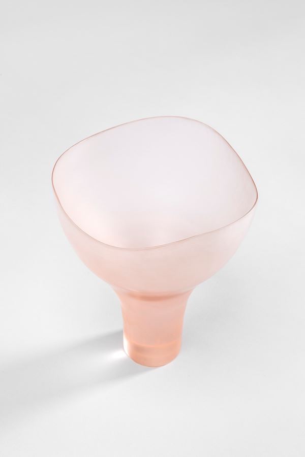Vetro soffiato rosato, battuto, rifinito alla mola.
