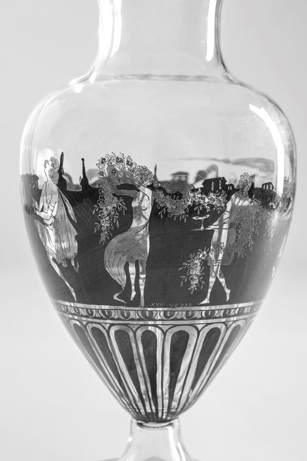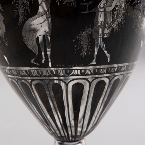 Vetro soffiato incolore, superficie decorata con smalto nero a soggetto neoclassico.