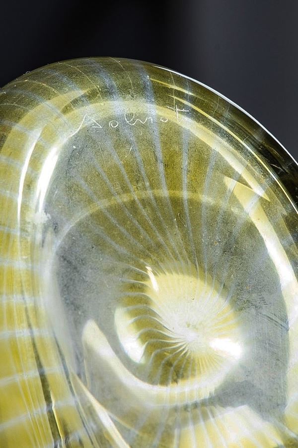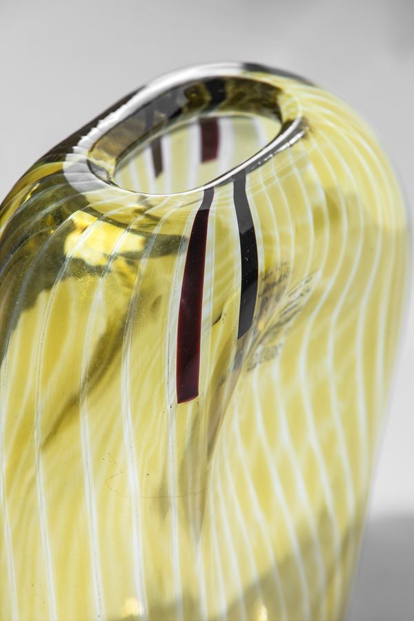 Vetro soffiato con decoro di canne policrome gialle e viola.