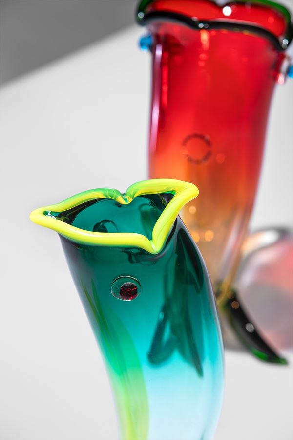 Vetro soffiato e lavorato a mano con filo riportato a caldo.