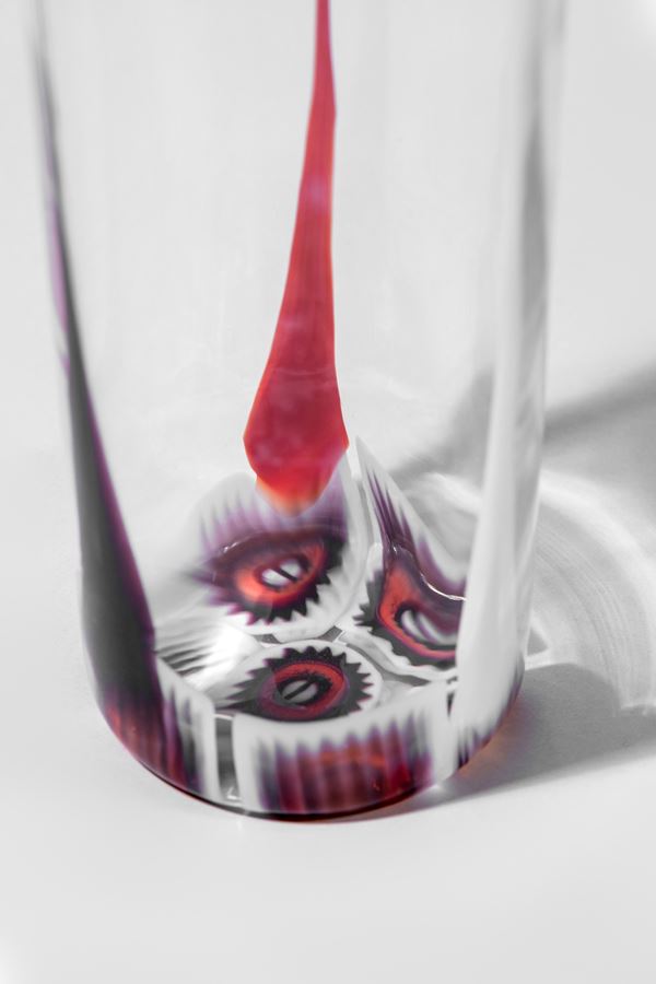 Vetro soffiato cristallo con murrine e tappo rosso.