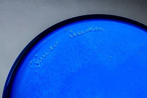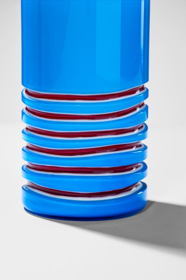 Vetro soffiato incamiciato con profonde incisioni orizzontali alla base.