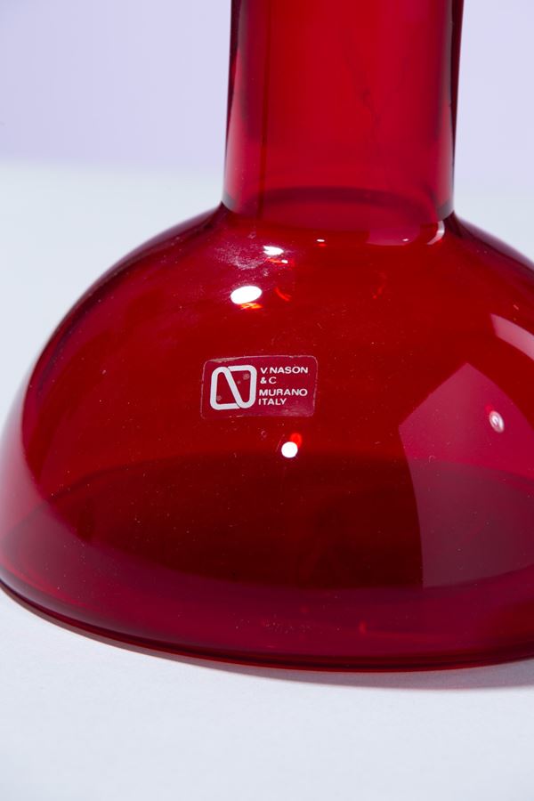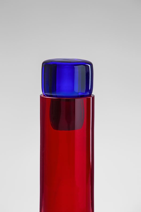 Vetro soffiato rosso rubino con tappo blu.