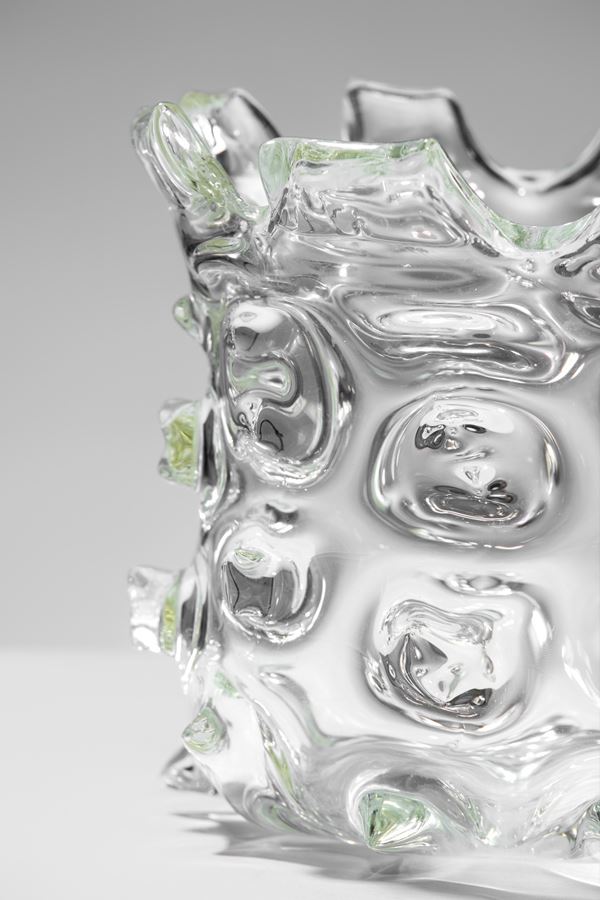 Vetro soffiato a forte spessore, il bordo rifinito a festoni.